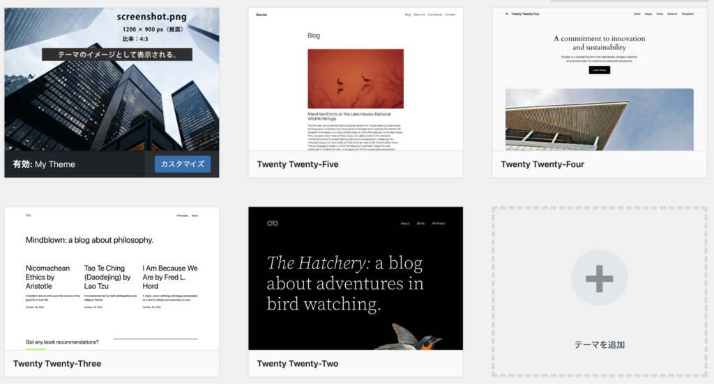 管理画面から、「外観 > テーマ」の中に、自分が作成したテーマが見えるようになればOKです。