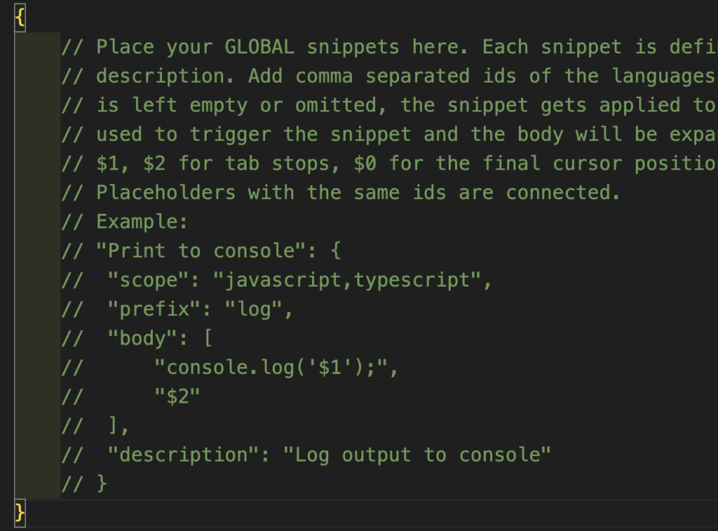 新しいスニペットファイルは、緑色のコメントが並んでいます。コメントは、消しても問題ありません。